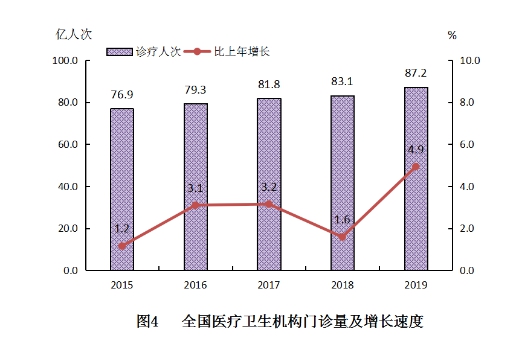 (一)門診和住院量。2019年,全國醫療衛生機構總診療人次達87.2億人次,比上年增加4.1億人次(增長4.9%)。2019年居民到醫療衛生機構平均就診6.2次。